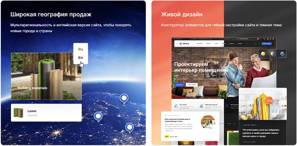 Региональность помогает продвигать бизнес в нескольких городах. А чтобы выйти в новые страны, на сайт можно добавлять языковые версии. Подготовьте проект к общению с клиентами на языке международной торговли. Весь сайт уже переведен — вам остается наполнить только свой контент. Выходите на международный уровень и продвигайте бизнес в новых масштабах!