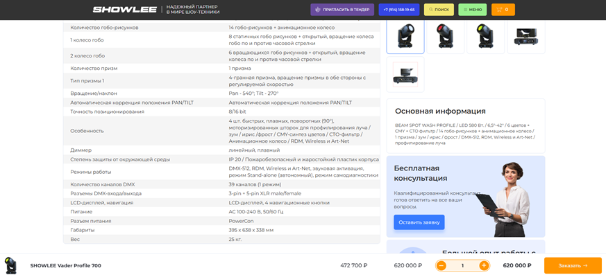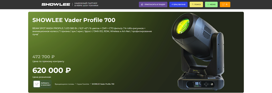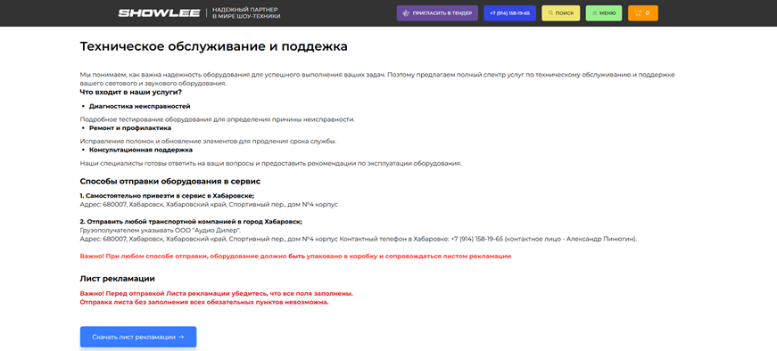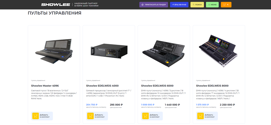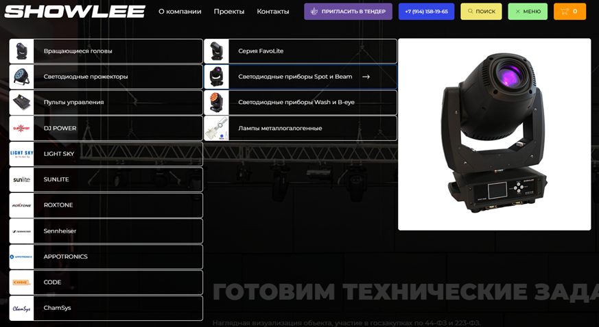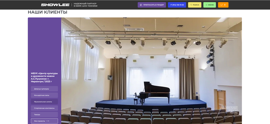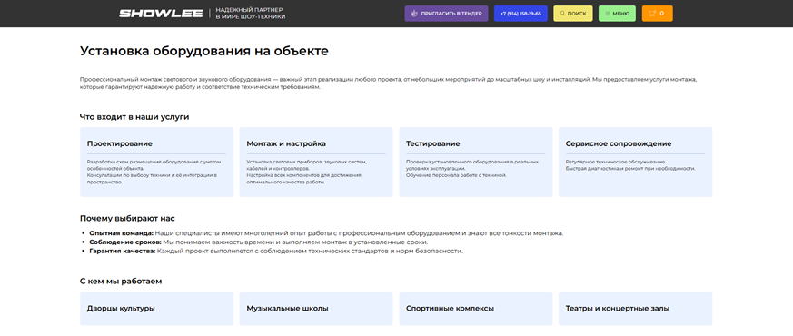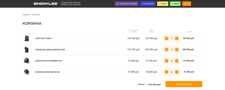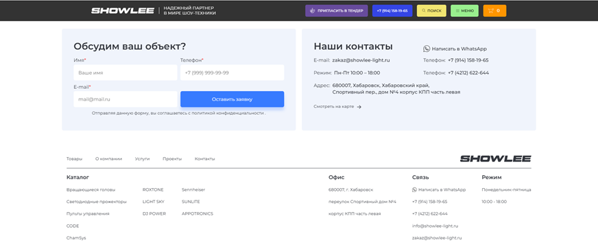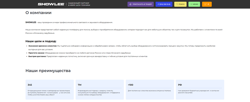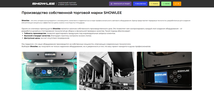 Цель: создать современный, функциональный и удобный сайт для компании SHOWLEE, специализирующейся на продаже профессионального светового и звукового оборудования. Сайт должен стать ключевым инструментом для привлечения клиентов, демонстрации продукции и услуг, а также укрепления имиджа компании на рынке.