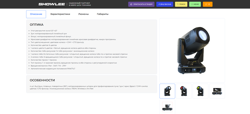 Сайт представляет интернет-магазин с качественно проработанными детальными страницами товаров, на которых выведены основные информация и характеристики товара, приведены технические сведения о продукции, включая габариты, используемая оптика и т.д.