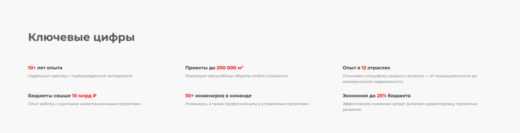 - Блок «Ключевые цифры» в современном стиле, демонстрирующий статистику компании (реализовано проектов, общий бюджет и т.д.).