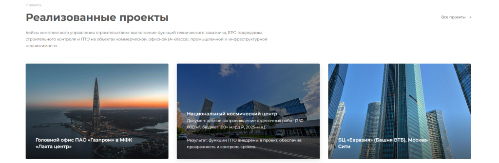 Задача: Разработать современный, функциональный и представительный корпоративный сайт, который станет ключевым инструментом маркетинга и привлечения новых клиентов. Сайт должен не просто рассказывать о компании, а наглядно демонстрировать ее экспертизу, сложность реализуемых проектов и выстраивать доверие с целевой аудиторией (крупные застройщики, инвесторы, государственные заказчики).