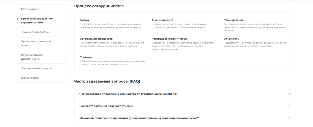 - Для репутации: Проработанный контент и структура сайта формируют образ надежного, экспертного партнера в сфере управления строительством.
