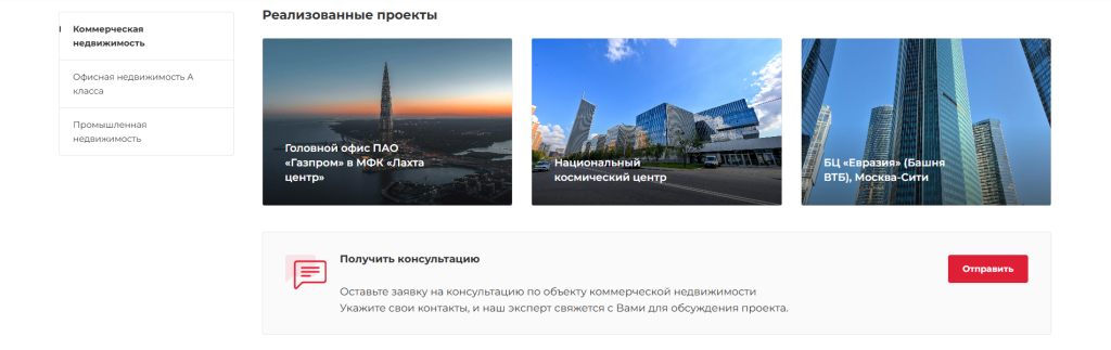 - На страницах отраслей наглядно показана экспертиза компании за счет привязки реализованных проектов, описания специфичных подходов и нормативной базы.