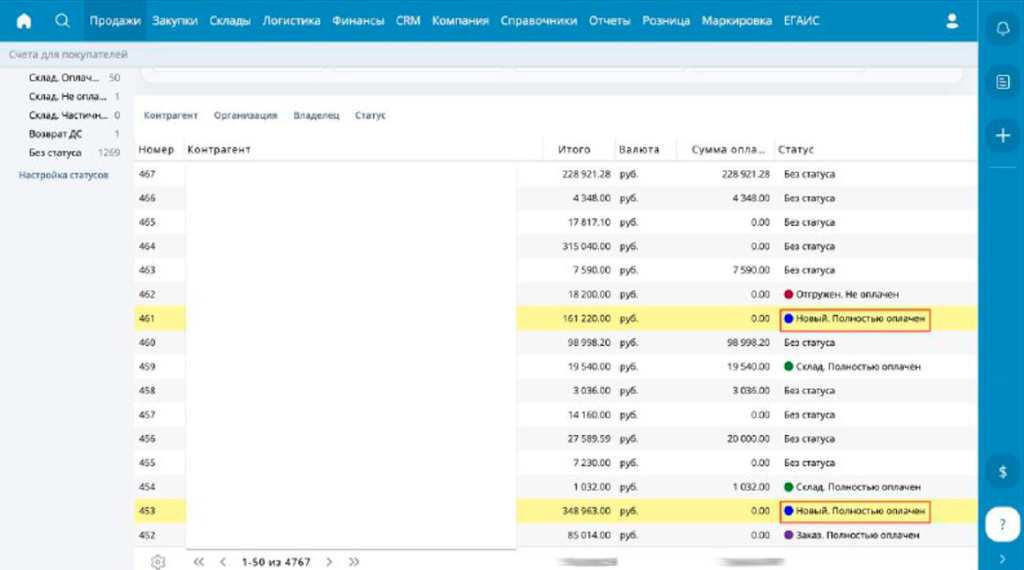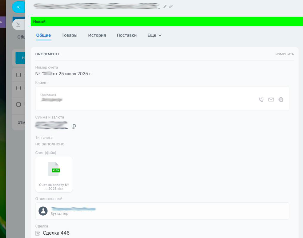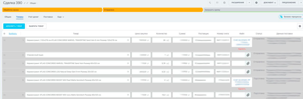 - Товарные позиции в сделке, включенные в поставку, блокируются для редактирования.