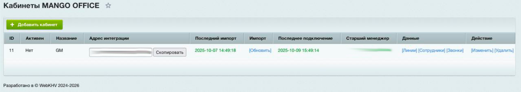 - Возможность подключения нескольких кабинетов Mango с определенными параметрами (синхронизация с проектом, сопоставление менеджера в телефонии с пользователем в Битрикс, учет статуса подключения);