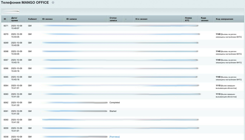 - журнал событий (успешные и ошибочные запросы, необработанные звонки).