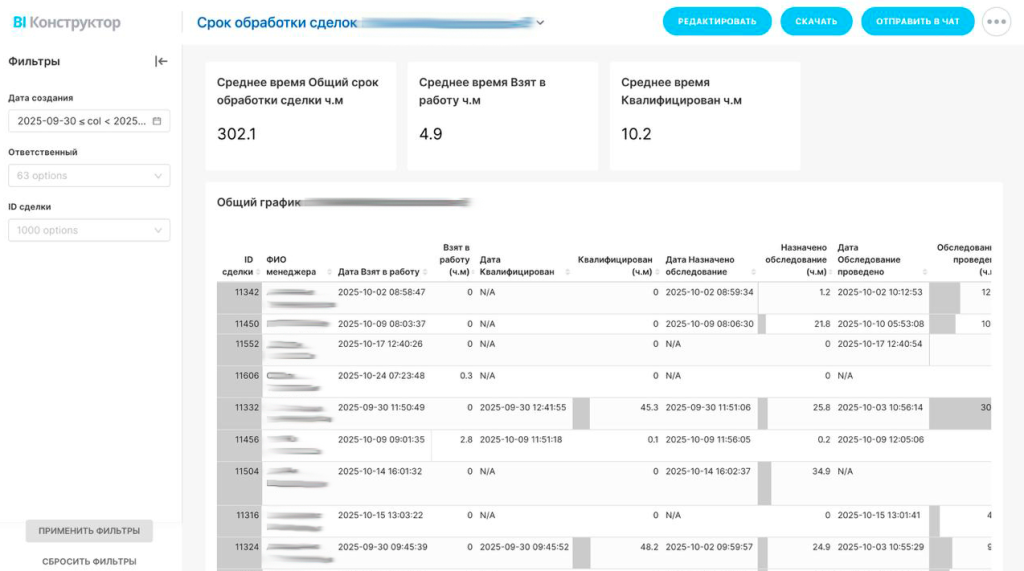 - Объективная оценка нагрузки: Появилось понимание реальной загрузки менеджеров: стало видно, кто «тащит» сложные долгие сделки, а кто быстро закрывает простые.